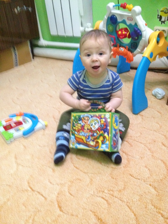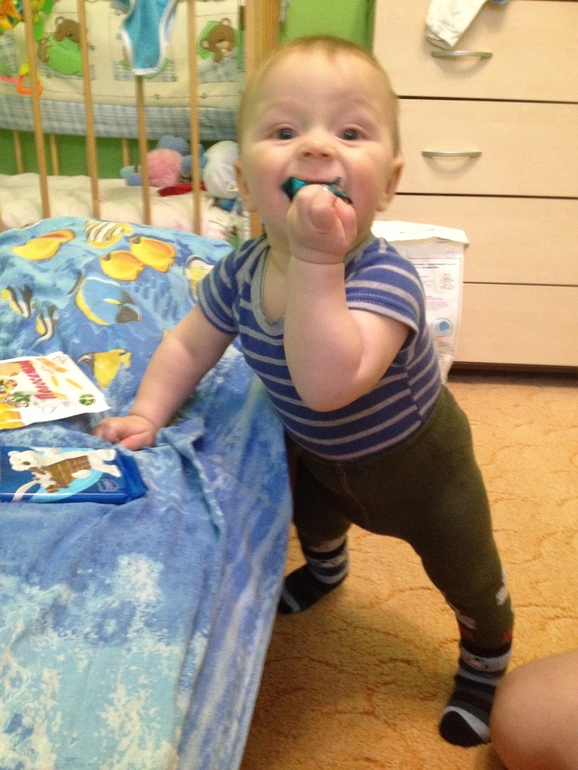 Быстро ползать и везде вставать. Может стоять отпустив руки секунд 5. При чем это его ужасно забавляет, стоит потом на попу плюхается. Говорит ма- ма, ба-ба, брр язычком.