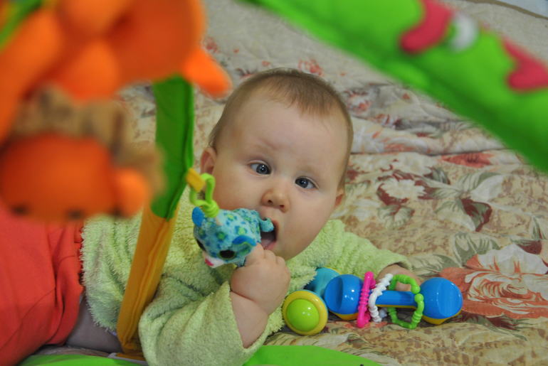 Из умелок: научилась визжать, как резаная, но с абсолютно довольным лицом. Сидя хватает лежащие рядом игрушки и выпрямляется обратно. Ползает на пузе, начала вставать на четвереньки. Ну и продолжает грызть все, до чего можно дотянуться. Нашла свои ножки и обнаружила, что они на вкус очень даже ничего, даже если в носках!