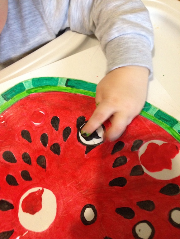 Дальше под кат... В общем с утра я приготовила сыну вот такой арбуз, " заламинировала" его скотчем ))))))) чтоб многоразового пользования он был...