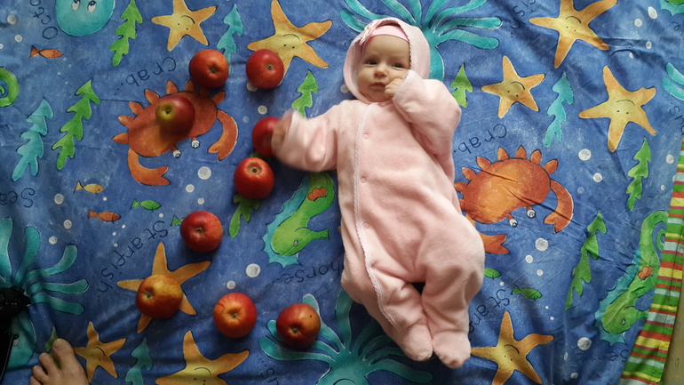 А теперь об умелках.Головку держим хорошо,крутим ей во все стороны.Любим залипать на телевизор и зеркало.Ааа...ещё на люстру,я на неё повесила погремушки и шарики.Купание по прежнему наше любимое занятие.По выходным купаемся в большой ванне с кругом,а в будни в маленькой.Гуляем на улице каждый день.Спим в коляске,когда едем.Стоит остановиться и кряхтим.Улыбаемся во всю.Коврик,мобиль и стульчик только по 10-15 мин.Больше любим на руках.Папа приучил,вот он и носит.Засыпаем на ночь,правдо,в 2-2.30 и просыпаемся в 11-11.30.Сегодня нафоткались много.Всё не могу добраться купить фотоальбом.Фотки тоже ещё не делала.