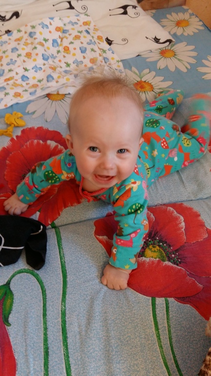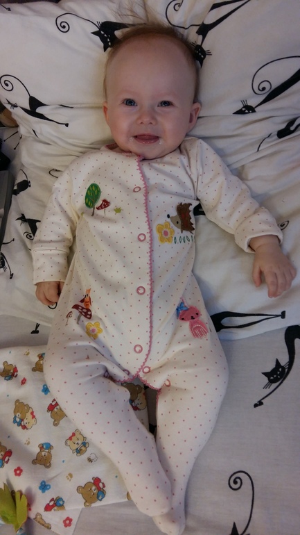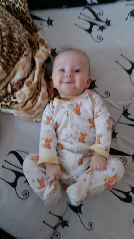 Кувыркается,но не ползает пока. Сама не садится,только если посадить и то недолго. Опирается на ножки,если поставить. Когда я что-то ем,так и норовит забрать, а если не дать, начинает злиться и плакать! А еще очень любит шляться везде с мамой на ручках. Обожает купаться,особенно в ванне с кругом. Любит когда я пою ей песенки или рассказываю стишки Барто и читаю книжки!