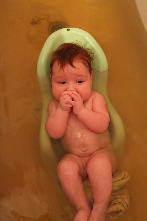Купаемся каждый день,сначала плавали в маленькой ванне,потом перешли на большую с кругом,вчера поняли что круг мал и перекочевали в горку.Соня быстро поняла,что водичку можно пить и теперь облизывает кулачки и пытается хлебать,переворачиваясь на бочек)муж пресекает))