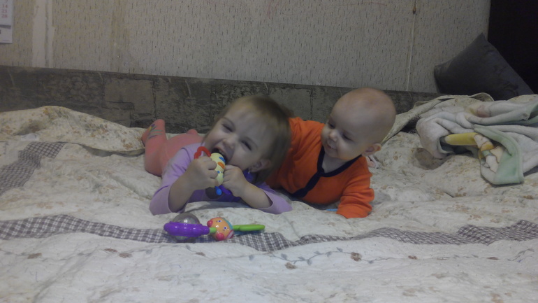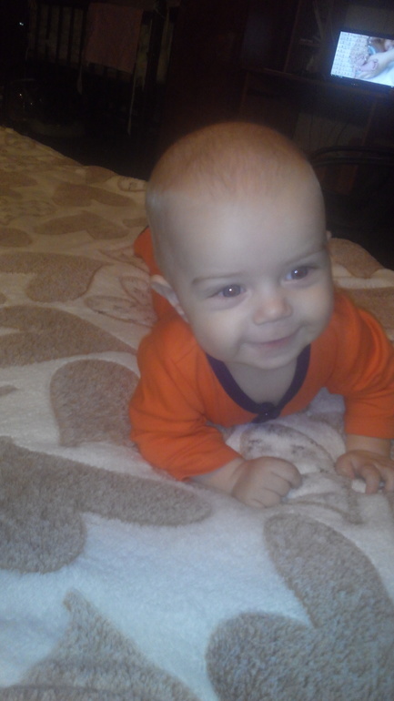 А так малыш улыбчивый,ко всем идет на руки!Начал за мной гоняться,в туалет просто не сходишь,приходиться по-тихому по стеночке уходить ,чтобы не попадать в поле зрения!Так что растем !