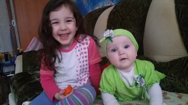 Тоже очень любит свою сестру, как только начала отличать ее,только за ней наблюдала, положим ее на живот на колени она и лежит на нее только смотрит, головой крутит, куда старшая, туда и она.Сейчас все время хочет ее кусать, хватать, руками машет, кричит, когда Марины нет, она ее ищет.В Общем Любовь у них....