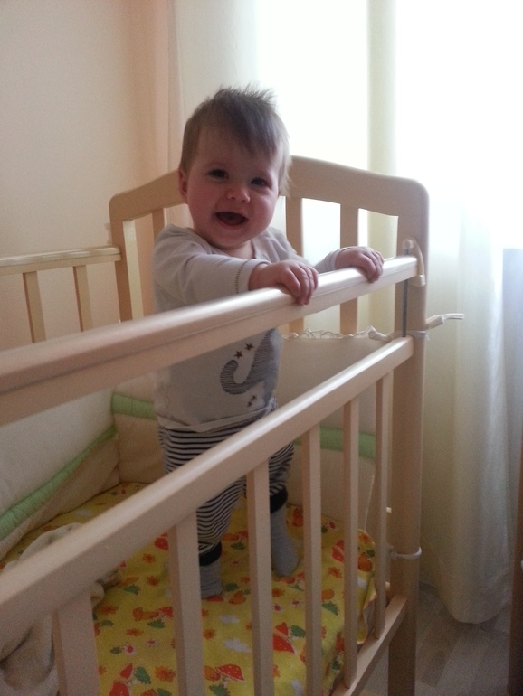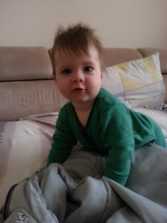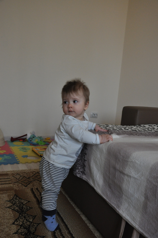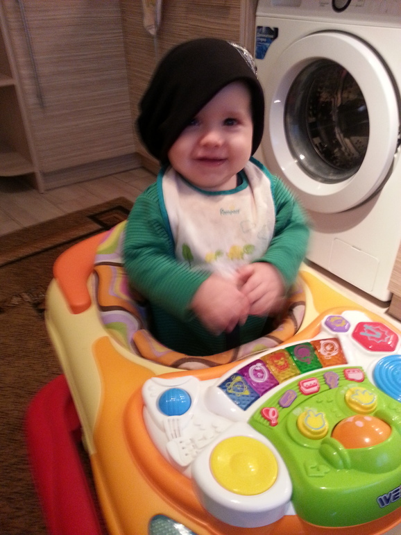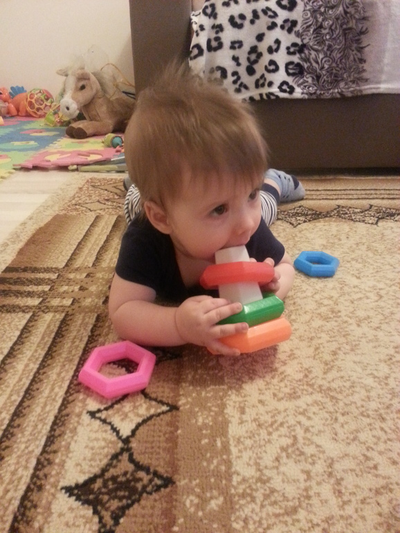 Что умеем: Стоим у опоры, ходим у опоры, стали любить играть сидя, разбираем мамины кухонные шкафы с кастрюлями и сковородками, лазить в стиралку, помогать маме грузить посуду в посудомойку, нажимать все кнопки в поле досягаемости, смотреть мультики, разбирать пирамидки, разрушать мамины башенки, построенные из кубиков специально для этого)) Постоянно что-то бормочем, говорим, любим говорить баба и только когда долго не видел меня - то когда видит, ползёт со скоростью ветра ко мне с фразой: "А, мама!"