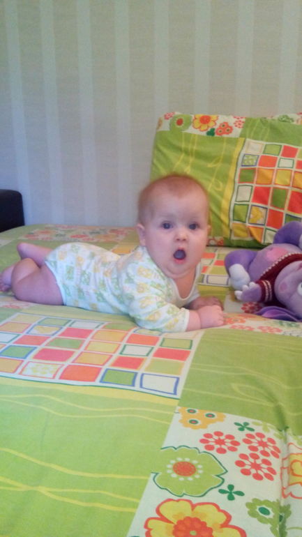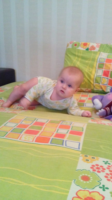 Физическое развитиеВот нам 5 мес., так быстро время летит, недавно лежала с огромным животом и мучалась от изжоги! Ходили в поликлинику взвешиваться, весим 8700( + 400), рост 66 см ( + 2 см).Доченька такая активная, переворачивается во все стороны, становится на колени и если увидит что-нибудь интересное, например пульт от ТВ или телефон, то ползет. Старшая дочка почти не ползала.Сашуля очень любит сестру, радуется ей когда она приходит с тренировок или школы. Смеется, завлекает ее, чтобы она обратила на неё внимание.Сидеть ещё не можем, злимся что не получается сесть. Поэтому любим на руках повисеть. Со сном проблема, спать стала ещё хуже, это просто невыносимо. 2 последние ночи не спали совсем. Не могу найти причину, то ли зубы то ли животик, то ли на сисе повисеть надо. Просыпается, плачет, на руках носим, засыпает на 10 мин.и снова плач. Хотя днём весёлая активная девочка) Врач посмотрела сказала зубов пока не видно. Почему моя пышечка не спит ночью, не понятно. Хотя чему я удивляюсь, старшая такая же была, до года не спала. Мы ее и по врачам таскали искали причину, а невролог сказала, мамочка это у вас грудь вместо соски, вот и не спит.И правда, как только бросила кормить в год, стала хорошо спать. Неужели и с младшенькой так будет?!