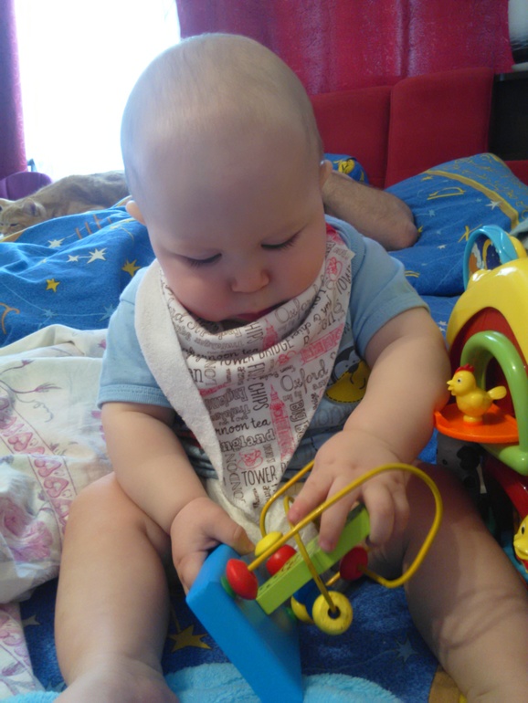 Ходим у опоры, держась за что-либо поднимаем игрушки, присаживаемся на корточки и держимся одной ручкой. За две ручки бегаем, а за одну идем карявенько. А 22 февраля он поднялся, отпустил ручки от папиного пуза, выпрямил спинку и стоя осмотрел нас, улыбнулся и призямлился на попу, короче простоял без опоры секунд 5, мы были в шоке. Теперь это самое любимое занятие. Болтает на своем языке,так смешно. Произносит много слогов, мамама,бабаба,папапа,ляляля,тятя,дядя и еще что-то. Научились махать пока, особенно бабушке по скайпу. Ладушки любит показывать но не как надо, а просто ладошками стучит друг об дружку. Знает где мама, папа, киса.