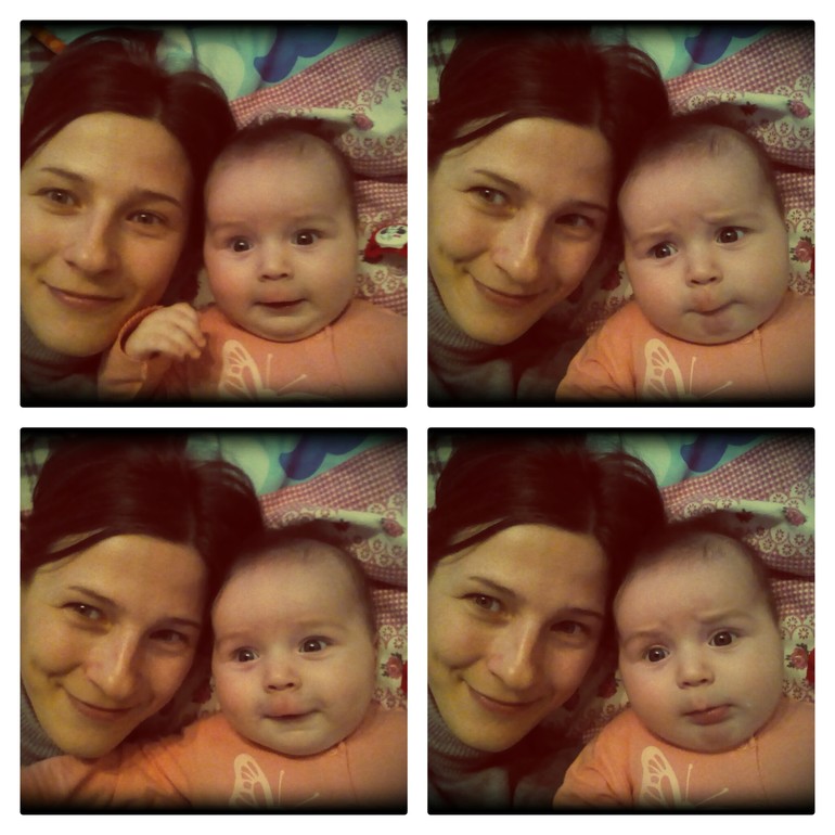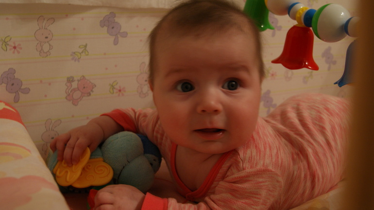 Новости наши. Хотим сидеть и стоять.)))) Хватает меня за пальцы и подтягивается, чтобы сесть (вот стоило мне раз 5 ей показать во время зарядки нашей), при том ей очень даже удается, а когда "сядет", толкается ногами и встает. Ну, конечно же, при этом я Нику держу, но гордости ее нет предела. Полюбили делать топ-топ. Беру ее подмышки, ложусь на спину и держу над собой - Никуша улыбается во весь рот, смеется, издает звуки восторга, толкается и переставляет ножками. Это теперь любимое занятие, бывает, требует у меня, чтобы я ее подняла. В общем, теперь мы нацелены на вертикальные положения. Переворачиваемся во всех плоскостях - обкладываю подушками пока, жду пока в марте приедет подруга и даст манеж. Ползти никак не пытаемся уже, бросила все попытки. Хватает все, что в поле зрения. Причем, игрушки, она свои, конечно, любит, но больший интерес вызывают компьютерная мышка, памперс, кошка, бумажки, недавно целый час разбиралась с пачкой салфеток.)) А еще я ее зацеловываю все время - а она хихикает и улыбается, ох люблю эти моменты.))
