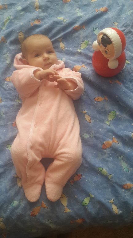 Столько много новых умелок к 3 мес.Улыбаемся всем и всегда.Любим агукать,причём делаем это так по девичьи,протяжно.Милота!Ручки свои нашла,разглядывает их.Игрушку протягиваешь-хватает и сразу в рот.Вообще всё в рот тянем.Особенно вкусные кулачки и пальцы.Соску не берёт.Давится прям ей.