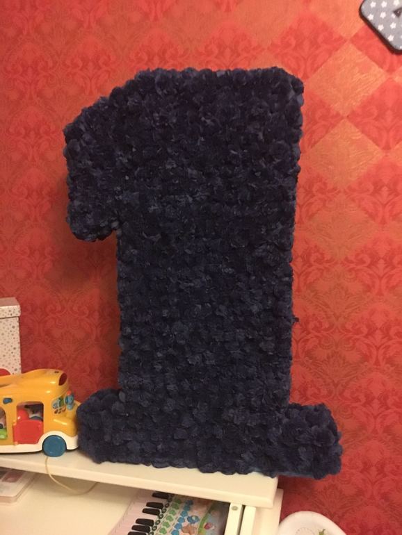 К др готовились за ранее. Я сделала единицу из картона и обклеила цветами, заказали шары и очень вкусный торт .
