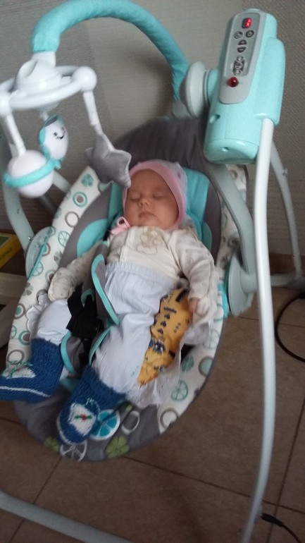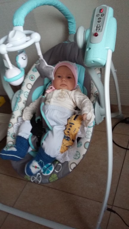 Вырастаем из ползунков очень быстро, все что я накупила во время беременности и плюс вещички сына пригодилось. Единственное не одевала боди с коротким руковом 56 размера, так только с фоткать один раз. т.к. холодно для рукавчика короткого в квартире и плюс не очень удобно, то что боди, а она еще махонькая была для 56 размера. А так все вещи носим и носим с удовольствием! Чудо качели, не знаю, что без них делала бы, ложу, она качается, слушает музыку, смотрит, как мама двигается по кухне готовя еду и засыпает, просто чудо качели, обожаю их.