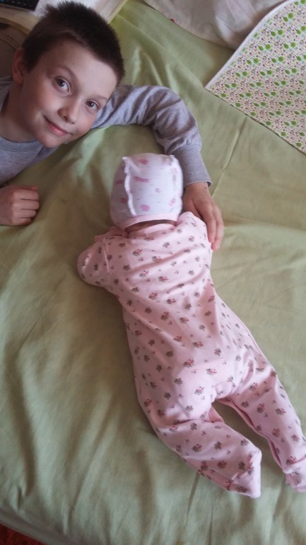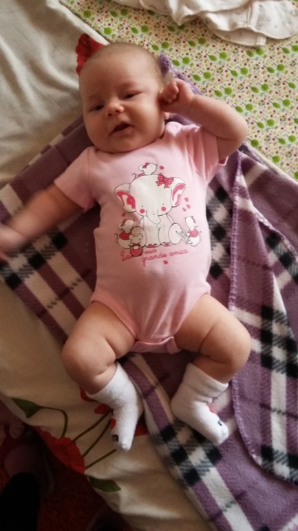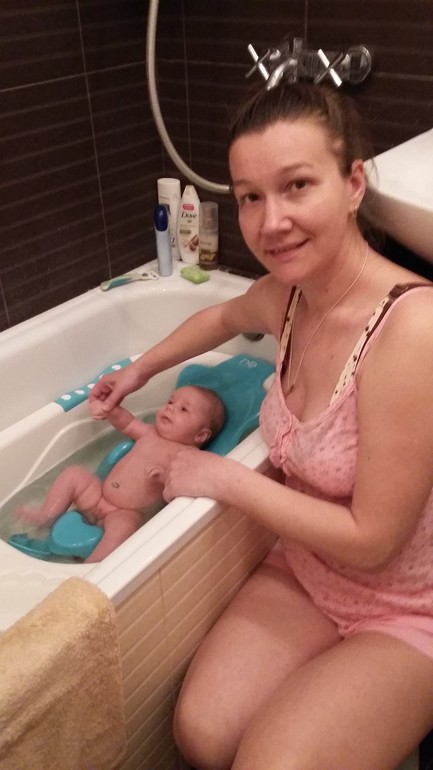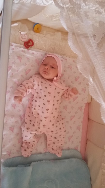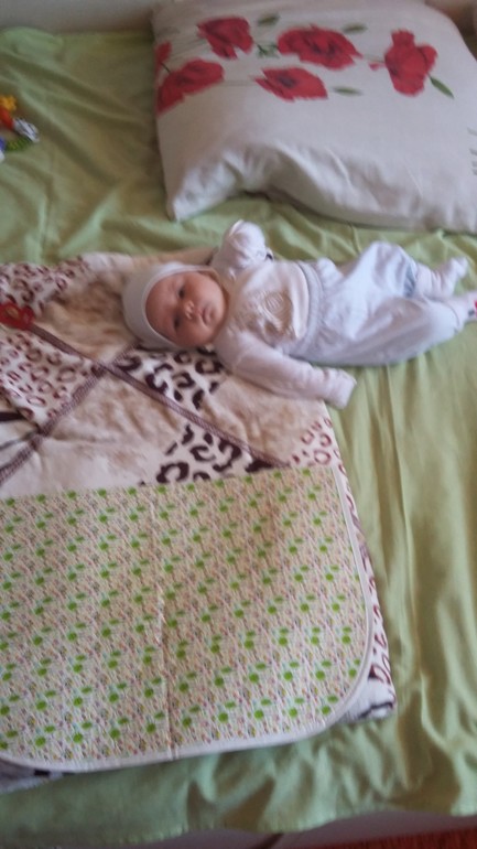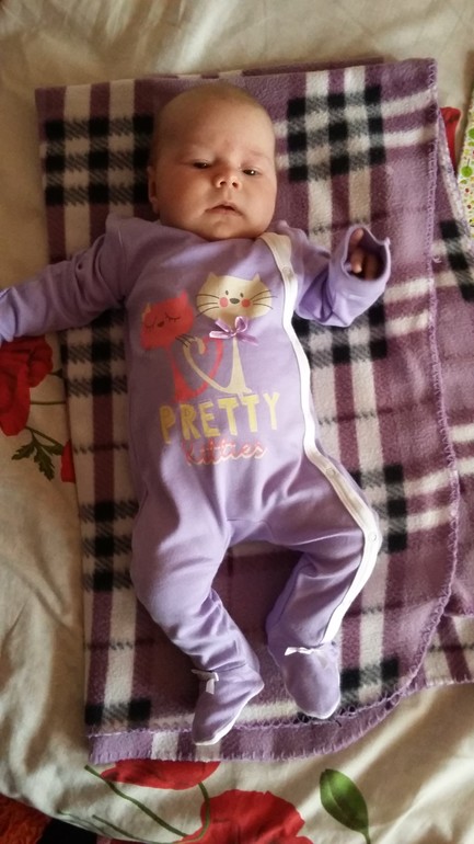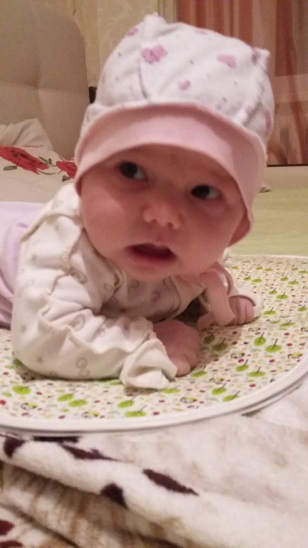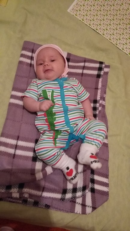 Чаще стала играть и гулять, меньше сна, к режиму мы уже привыкли, ночью спим спокойно, кушаем пару раз! Ногти растут очень быстро не успеваю подстригать, точно девочка, у сына так быстро не расли! Кушает Вета по требованию, приблизительно в среднем через два часа. Лебит тепло и тесноту, ночью еще одеваю на нее кокон наш ночной, ниже фото будет, а днем уже не пеленаемся. В кроватке не особо любит, но приучаем потихоньку, Засыпает и мы ее в кроватку, а когда ночью просыпается, то мы ее оставляем уже с нами. Повились любимые погремушки, которым она очень рада и улыбается! Купается она с удовольствием, водичка ей очень нравится, но вот когда вылазить из водички начинаем плакать, до тех пор, пока грудь ей не дам. Стали сосать кулачек и пальцы, да еще и так причмокиваем, на всю квартиру слышно, чем доча увлеклась.