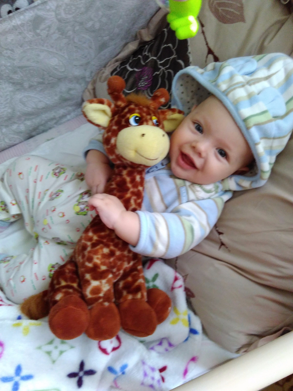 Любимые игрушки - погремушки ярких цветов и жирафик на фото! Смотрит ему в глаза и рассказывает что-то на своем, жирафьем