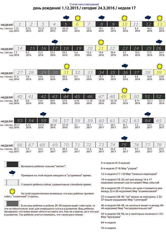 Вчера нашла интересную табличку с кризисами до года. У нас 17 неделя, и как раз это время считается непростым. Вот мне и стало любопытно: действительно ли это так? Вы помните свои кризисы до года, и какими скачками в развитии они сопровождались? Или мне стоит списать изменившееся настроение на погоду и, может даже, на зубы (хоть и рановато еще, нам же нет и 4 месяцев)?