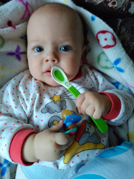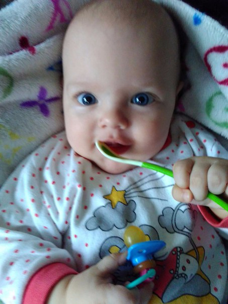 Уж очень он хочет сидеть с нами за одним столом, а особенно есть то, что мы и тем, чем мы))) Купила ему силиконовую ложечку и тарелочку на липучках (на будущее), теперь он с ложкой не расстается!