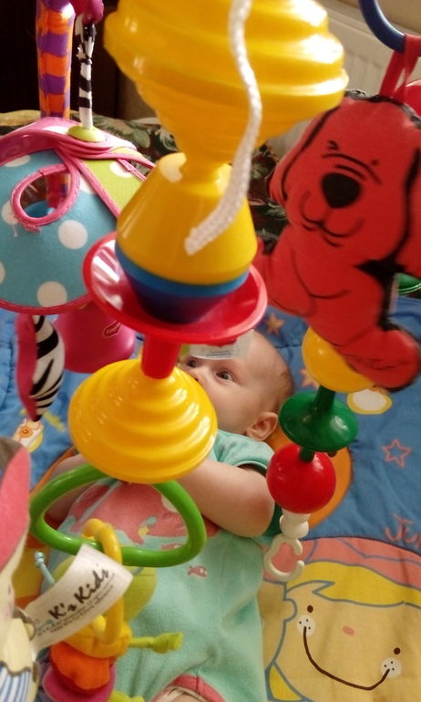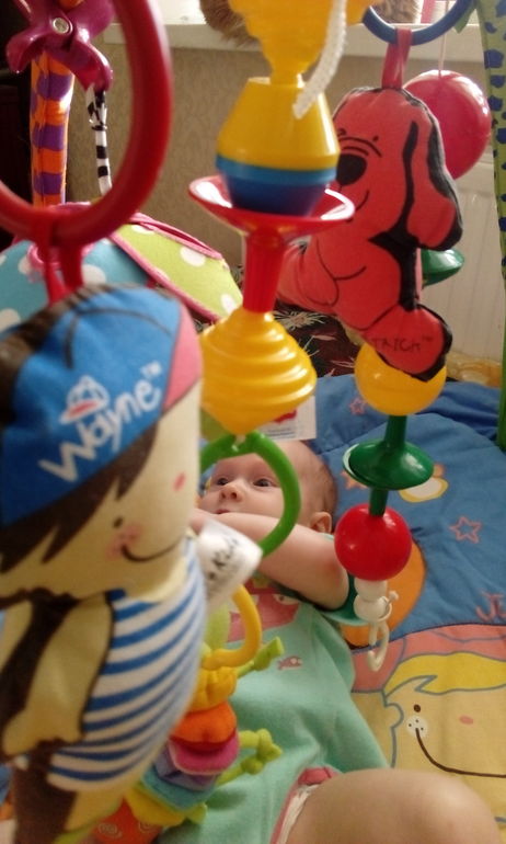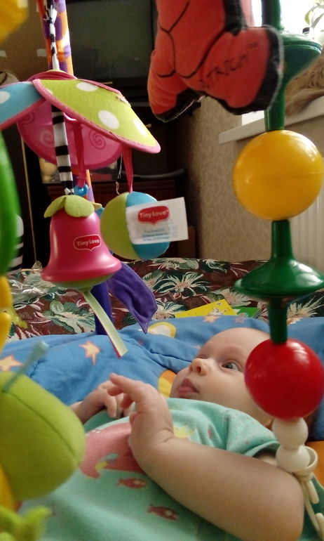 ИгрыНавешала все игрушки, которые были под рукой. Дочь лежала как завороженная, даже кулачки в рот не пихала.