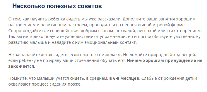 Хорошая небольшая статья! Я не читала такую,как то само получилось?что ребенка рано стали присаживать.с 4,5 мес.а в 5 он сам сел (в коляске ),видимо захотел мир посмотреть )))теперь нам без недели 6мес. Сидим вовсю в стульчике и в коляске и на коленях градусов под 50-60. Спина готова (я кстати именно упражнения из статьи делала,на you -tube нашла).так что это правильно -нужно ребенка постепенно готовить !