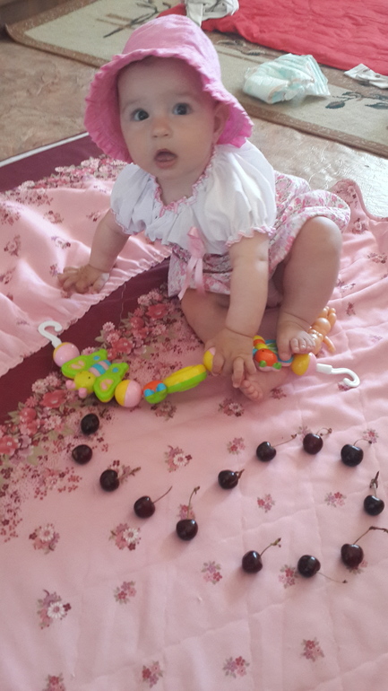 Ну и фото напоследок.Плохая затея была с черешней.Викуля её всю почти потрусскала.Она её очень отвлекала.И я никак не могла ее сфоткать нормально.