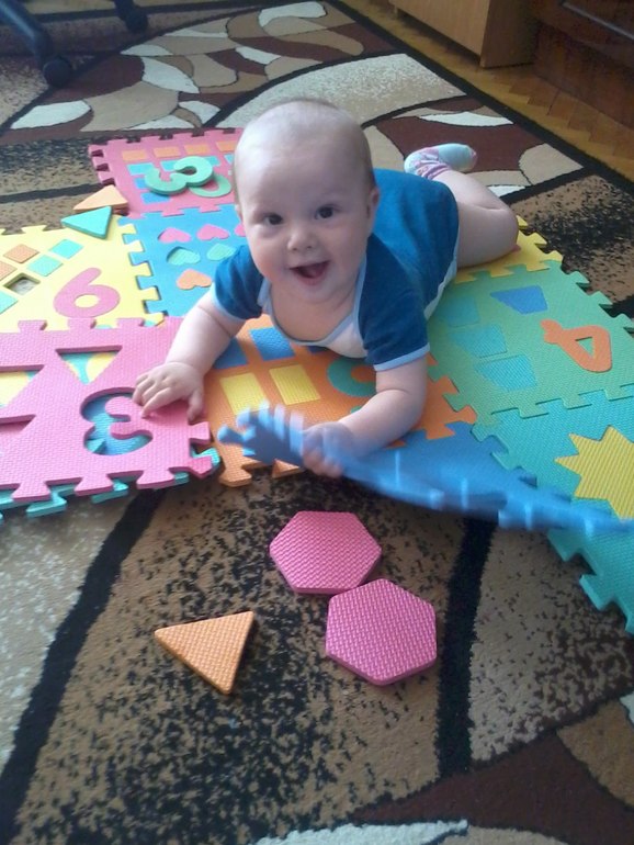 ЗнакомимсяБыло вчера, вес 9250, рост около 80, кушаем яблоко, тыкву, кабачок, цветную капусту, морковку, картошку, мясо нутрии и кролика, банан, овсянку и гречку, детские печеньки в виде перекуса в ниблере, кушаем 3 раза в день, остальное время грудь по требованию, спим 3-4 раза в день, промежутки между снами удлиннились до 2,5-3часов, стоим на четвереньках, шатаемся как хамелеон, но не ползем, хотим стоять, но злая мама не разрешает =), хохочем, пугаем всех визгом, играем игрушками, перестали идти на руки к малознакомым людям и вобще стали мамсиком...