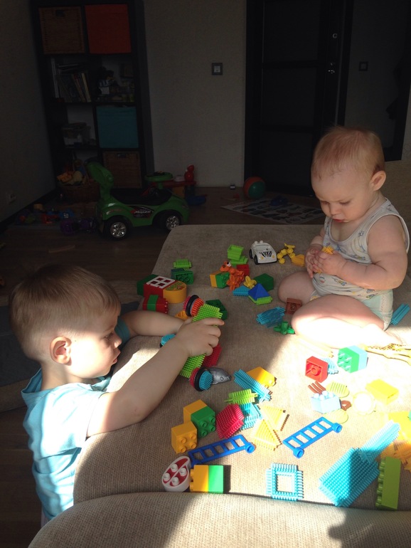 Саша очень любит поиграть с Ромой. Хохочет, когда он её щекочет. Если Ромы нет дома изводит меня, ноет, играть сама не хочет. Лезет на меня.