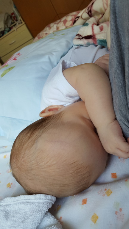 Обожает мамину грудь. Готова висеть на ней сутками еще с роддома. Пожалуй для меня это единственный неприятный момент. Не люблю я быть едой круглосуточно. Хотя, ради картины как дочка удовлетворенно сопит под грудью, готова потерпеть. Подозреваю что молока мало, поэтому висит на груди. Докармливаю смесью 2 раза на прогулках утром и вечером по 90 гр, иногда меньше . Иначе вообще бы гулять не ходили, малышка не вылежит 1, 5-2 часа без сиси. А старшей прогулки нужны, да и младшей не повредит.
