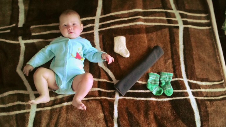 Хватает все, сует в рот. Переворачивается в обе стороны, встает на четвереньки, ползает назад, но старается передвигать ножки по одной вперед. Раскачивается на четвереньках, выбрасывает себя вперед с рукой, если впереди нужная ему вещь. Хихикает, если его развеселить. Играет в ку-ку.