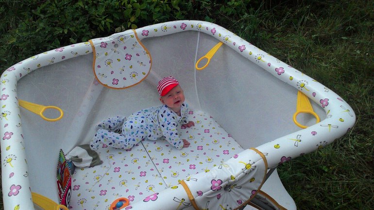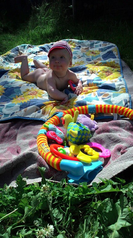 Жили много на даче в этот месяц, там почти все время на улице, кроме снов: гуляли в эрго, в манеже, на коврике. В городе гуляем в эрго.