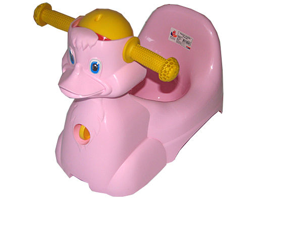 Касательно сидения на попе - оно у нас присутствует, но эпизодически, т.е. малыш может садиться на попу, а может и поджав ножки под себя, так что не могу сказать, что он сидит на 100% уверено. Хотя, допустим, у папы на плечах сидит очень даже вполне, цепляясь за волосы и изучая мир) Сказать, что я сильно уж спешу пересадить малыша на горшок я не могу. Но и упустить тот самый удобный момент не хочется. К слову, горшок нам подарила бабушка на пару с прабабушкой, и он выглядит довольно странно: