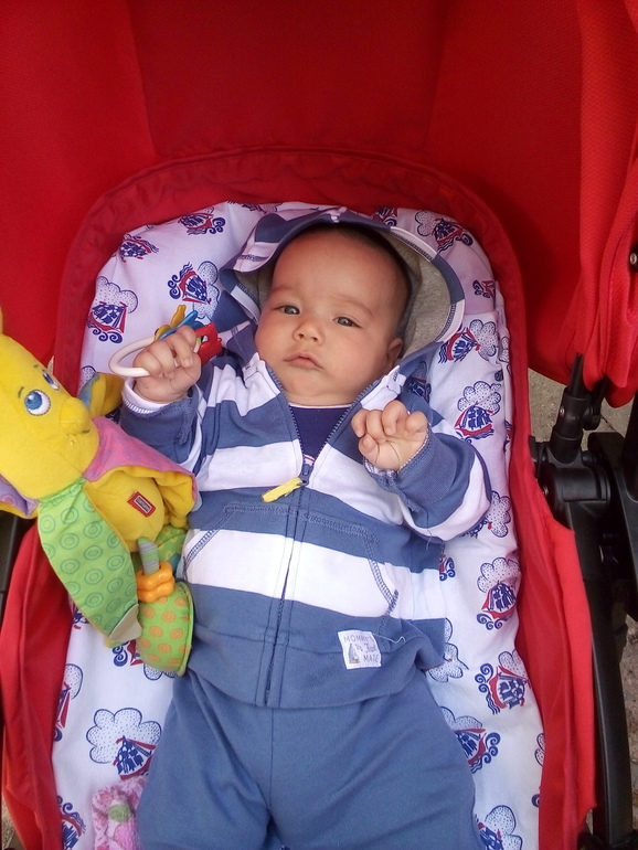 Сынуля продолжает набирать складочки, хорошо держит головку, и упирается на предплечья, тем самым обозревая, что творится вокруг него. Очень любит гулить, разговаривает на своем детском непонятном языке, жалуется если его что то беспокоит и улыбается во весь свой пока еще беззубый ротик, от которого щемит сердце от счастья и поет душа