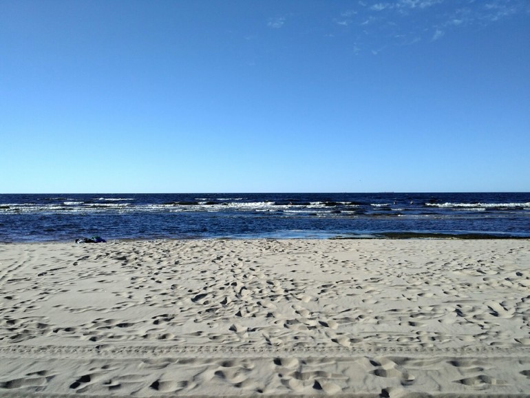 Поехали на один из рижских пляжей в Болдерай. Оставили машину, Веронику упаковали в май-слинг и отправились загорать. Пока шли по дорожке, дочка уснула, поэтому папа пошел в дюны раскладывать вещи, а я погуляла по берегу моря, помочила пятки и пофотографировала :)