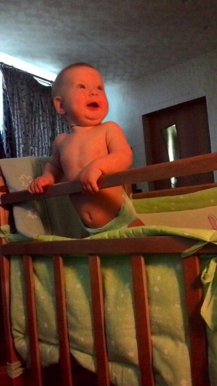 Сидит, ползает, стоит в кроватке, держась за бортик.