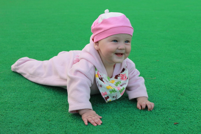 Сегодня зуб уже больше видно и мне кажется, что скоро появится второй, так как вчера ночь снова была очень тяжелой. Фотографии Полины с первым зубиком еще нет, но есть вот эта, сделанная несколько дней назад на детской площадке возле садика. Радовались последним дням лета и улыбались ещё беззубой улыбкой))