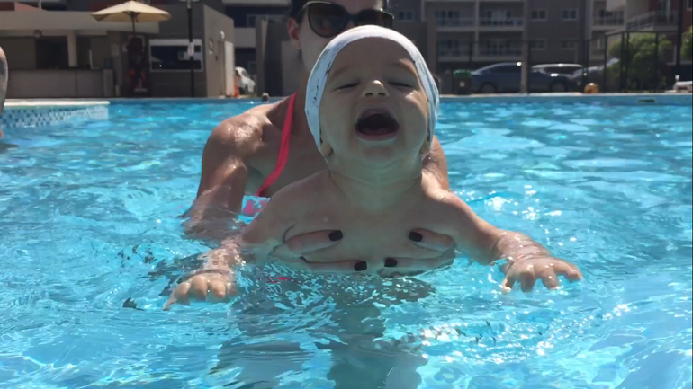 Мы так рано боялись в бассейн идти, вдруг зараза какая ( это открытый бассейн, возле дома, а не закрытый для деток ). А тут я уже не выдержала, жара такая, решили искупаться 😊