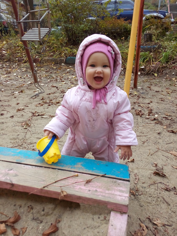 Зубов 5. Последние 2 зуба вылезли недавно, а именно 8 и 18 го октября. Из новых умелок Катя научилась махать пока и играть музыку на губах😎 пальцем бренчит по губам издавая звуки при этом-это папа научил. На улице стоит или ходит около песочницы, при этом пихая в рот палочки от листьев и камешки. Дома тоже как пылесос, все в рот. Или начинает точить зубы об мебель и ванну. Самостоятельно играет. Научилась пищать, аж уши закладывает. Кушает хорошо. И овощи и каши и фрукты и макароны и мясо/курицу. Любит желток яйца. Нет в меню только творога и рыбы. Сказали с 10 мес. Грудь ночью и днём на сон дома, или если канючит или болеет . Спит 2 раза по 30 мин. На улице час может в коляске поспать. Ночью у меня под боком.