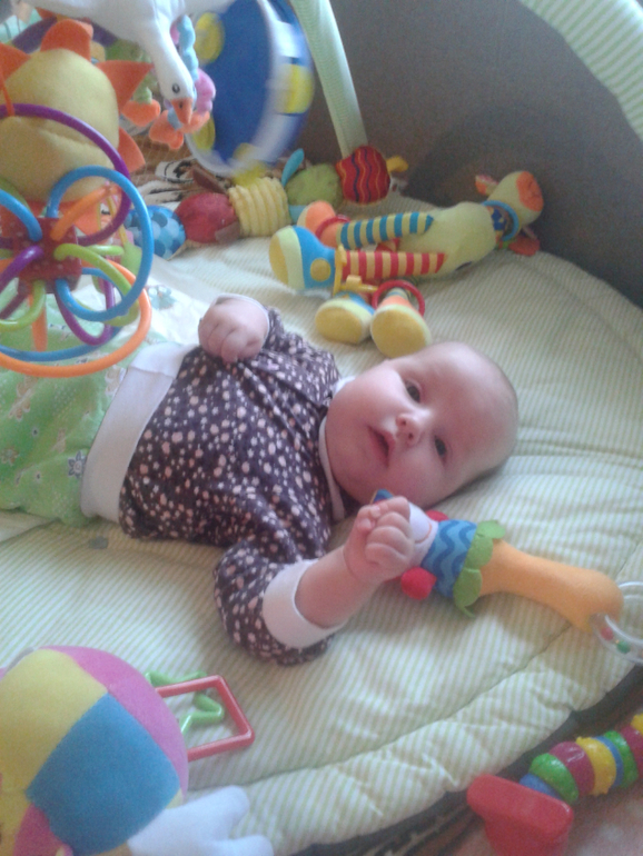 Физическое развитиеБыло вчера. Сегодня ходили на прием, вес 6800 рост 63см. Что умеем: улыбаемся, гулим, берет игрушки сама но держит не долго. Головку держит хорошо, на животе лежать так и не любит. Купаемся в большой ванной в круге, ножками и ручками не загребает, лежит как селедка, курсирует от бортика до бортика. Кушаем только титю, кулачки и пеленку. Переворачиваться не хочет даже на бочок. Спит ночью боле менее хорошо, днем два сна по 30-40 мин. и один сон 2-3 часа. Вот вроде бы и все. Растем дальше!!! Фото.