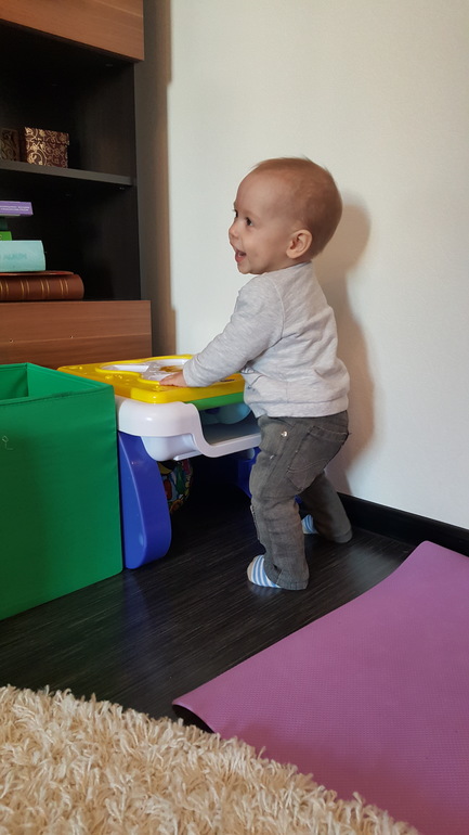 -отпускает одну руку,берется за другую сторону кроватки и перебегает туда. Чаще падает)) начал 8м и 11д