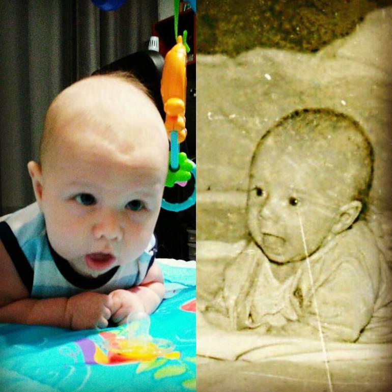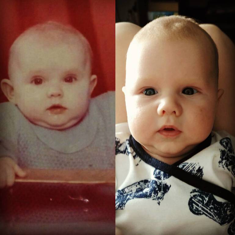 Форма головы папина а лицо мамино. А вобще у меня дочка по детским фоткам с моими фото - одно лицо, ей скоро 14 и вобще на нас с мужем не походит, израслась, а все говорили что будет копия мама , ничего подобного! так что и так бывает