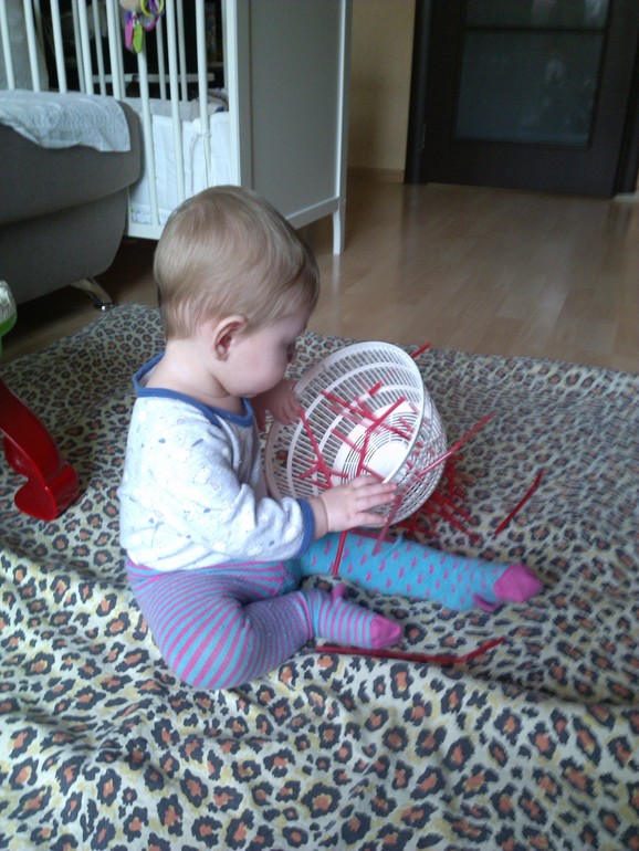 Моя дочка тоже непоседа) мне повезло, что ее 11 мес.выпало на лето. Гулчли по 2 раза по 2 часа стабильно. А дома открывала ей полки, где можно лазить и там она перебирала вещи, играли с мячиком, лазили ручками в гидрогеле, я делала физ.упражнения на пресс, а дочка наблюдала и лазила по мне. Единственная игрушка была интересна-это развтвающий столик Vtech. Остальные Игрушки не для нас. В свои почти год и пять, она не играет ни с перамидками, ни с кубиками, ни с конструктором. Попробуйте собрать коробку с шишками, камушками, каштанами и давпть ей перебирать. Мою ничто не увлекает на долго-все на минут 5, потом она уходит. На первом фото вот трубочки достаем) на втором- столик, а на третьем любтмая книга