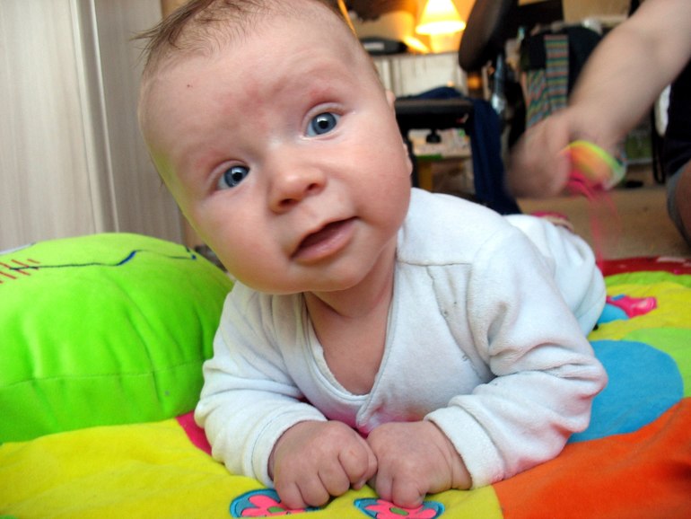► Перевернулся с живота на спину в 3 месяца. Без психов и долгих попыток. Но на один день, потом забыл. Вот только недавно опять начал пытаться это делать.