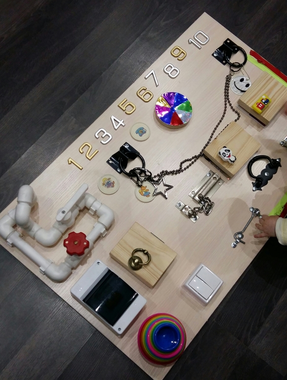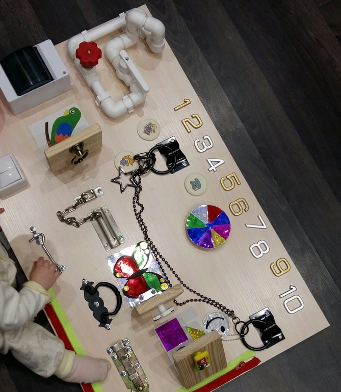 Теперь благодаря папе и Рита стала обладателем бизиборда. Мы с мужем вчера с таким удовольствием бродили по Леруа, выискивая что бы ещё могло понравиться Ритусе. А я приложила руку к оформлению разноцветным картоном (не думала, что это так утомительно). Сделали все за пол дня. Устали. Но я довольна.