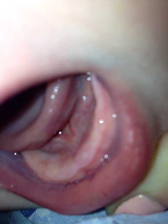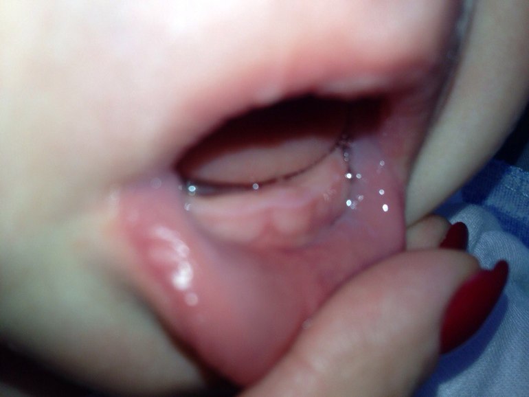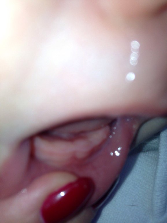 На следующий день я посмотрела десну и НИЧЕГО там не увидела. Десна была розовая, без белой точки. И вроде как все затихло, но вот уже два дня ребенок снова сам не свой, а сегодня вообще сплошное нытье и плохое настроение. Кушает плохо и с бутылки и с ложечки. Решила глянуть что там у нас с зубами. Вот что удалось сфоткать. Опять же я надеюсь на ваш зоркий и наметанный глаз!