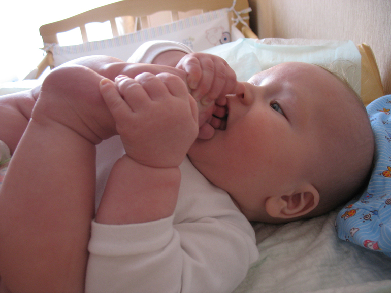 ► Нашел ноги. С удовольствием слюнявит пальцы на ногах, штаны, носки. Не всегда всё это попадает в рот, мешает пузо. Но пресс качает усиленно и вроде рад даже этому.
