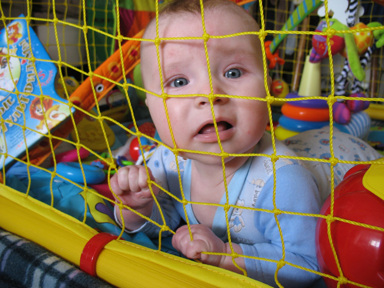 ► Купили ему манеж, т.к. хитрыми движениями стал выкатываться с коврика. Теперь закатывается в угол манежа и там сложившись пельмешкой грустит о чем-то своём :))