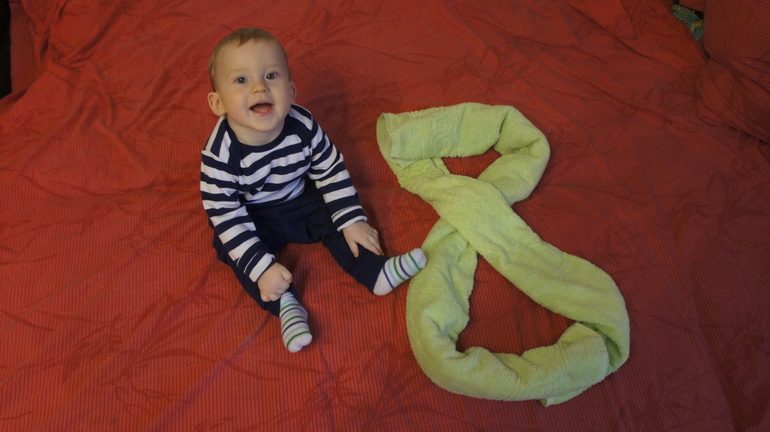 Научился махать пока-пока. Машет всей рукой сразу. Тут пока несла его в ванную мыть попу обмахался папе пока-пока. Иногда машет привет, но только кошке и мычит при этом что-то типа "ивееее".