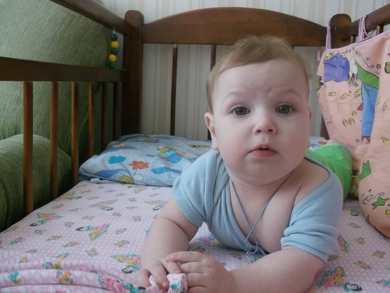 Не сидит, пытается ползать - как гусеничка, сначала ручки потом ножки), стоит с поддержкой