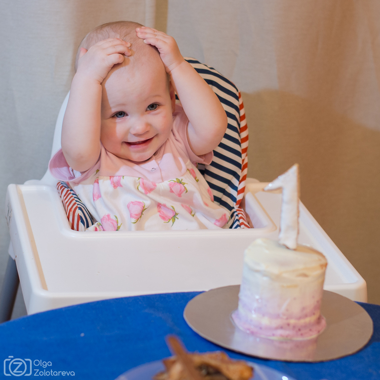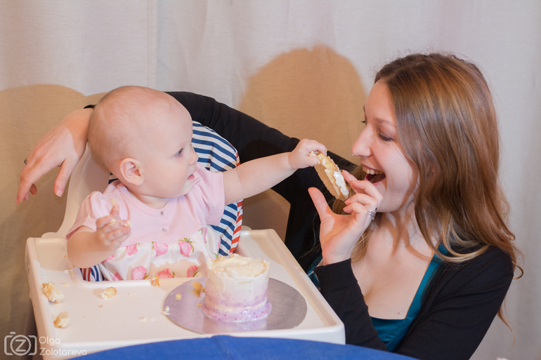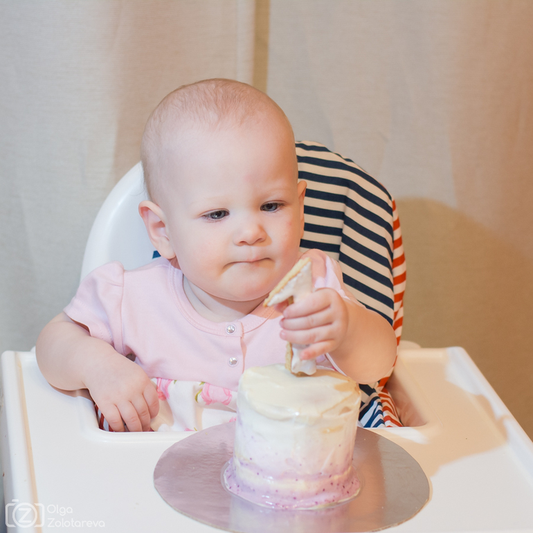 Для дочки был свой тортик. Тесто: классический бисквит, крем на основе детского мягкого творога, подкрашен черникой. Торт был воспринят дочкой на ура, не сколько съесть хотелось, сколько разобрать на части да угостить всех. В общем, забацали мини-версию smash cake фотосессии)))