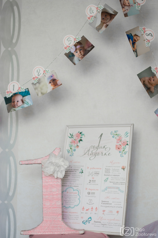- Полиграфию праздничную делала в Corel Draw, распечатывала в копицентре. Поскольку фотографическое качество в данном случае не было необходимым, печать вышла дешево. Были сделаны: постер большой (А2), растяжка 12месяцев (фото крепила на декоративные прищепки), топперы на капкейки (стояли на шпажках). Хотела топпер на торт еще из оргстекла, но пожадничала, а так лазерная резка смотрится здорово.