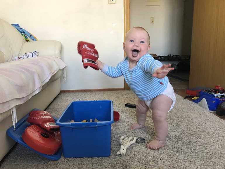 Ника становится все умней, научилась шкодить, то ботинки облизывать уползёт в прихожую, то ушлепает в спальню и дерёт цветок. А видит меня- улыбка для ушей, знает что нельзя:) когда вечером папа приходит- скорей к нему, руки тянет- возьми!