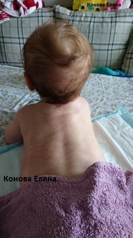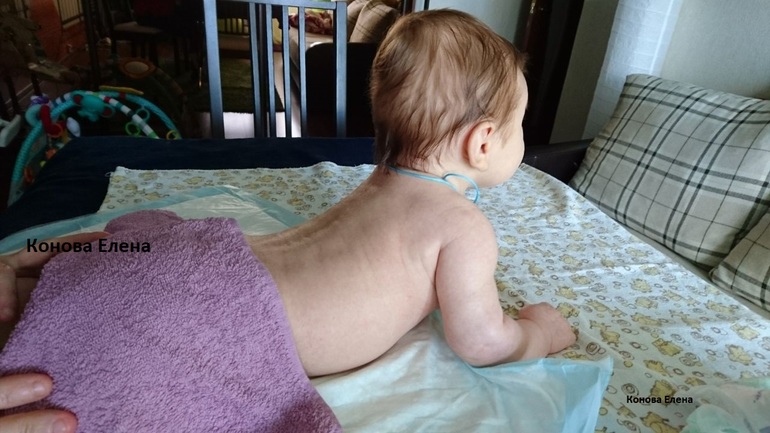 На осмотре. Доношенный ребёнок, не держит голову, привычное положение головы влево, повышенный тонус сгибателей верхних конечностей, повышенный тонус отводящих мышц бедра, в положении лёжа на животе голову мог поднять на несколько секунд, далее плакал, голова опускается и лежать на животе не может. Я попросила маму, чтобы во время массажа, когда ребёнок лежит на животе, ладонь мамы страховала лицо от резкого опускания, чтобы он не ударился носом. Видимая ассиметрия мышц спины, она изогнута. Первый и седьмой день был сложен технически тем, что у ребёнка шли колики. Мне несколько раз приходилось останавливать процедуру и поднимать малыша на руки, приводить ноги к животу, чтобы отошли газы и колика купировалась.