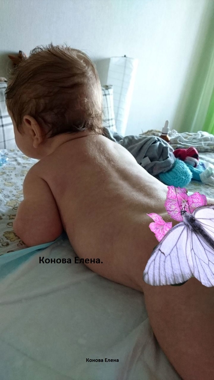 На 10 день что имеем. Голова строго по средней линии, равно как и спина, удерживает голову долго, не устаёт. Тонус мышц тела и конечностей в норме, начал играть игрушками и захватывать их. Мама была очень рада, мне подарили много фото, родители знают, что я буду писать этот пост, я выбрала только те, что показательны и не обнажают интимные части тела ребёнка. Ну и немного фото по дням. Это первые сутки и десятые, вид спереди.Это четвёртый и пятый дни, вид сбоку.
